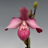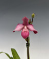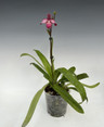 A specimen plant growing in a 5.5" clear container with two new, two old, and one blooming growth as of 9/16/23. A darker flower color than most of this cross. This also proves to be quite easy to grow.