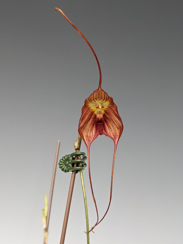 This is an exciting intergeneric cross between Masdevallia and Dracula, resulting in a vigorous hybrid that frequently produces maroon colored flowers. Allow the flower spikes to continue to grow so long as they are green, as these will continue to flower consecutively along the same spike.
