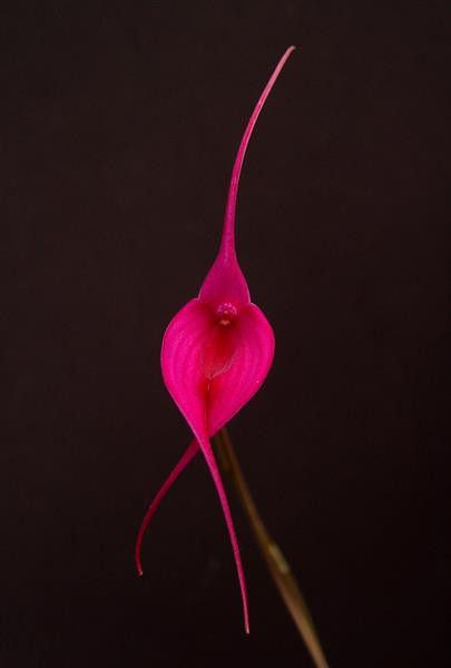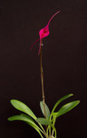 This is a very fine clone of perhaps one of the most intensley colored Masdevallia hybrids there is. The color is a very hot magenta purple. The color is so strong that it hurts your eyes to look at it for very long. Photography simply can't capture the intensity. The flowers are also huge at 7 inches long and the flowers last well. This hybrid also flowers off and on through fall, winter and spring. Likes cooler temperatures and loves to be grown in New Zealand sphagnum moss. Water as the moss approaches dryness but do not let the moss totally dry between watering.