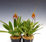 This thick-leaved Masdevallia hybrid astounds with its blood-orange flowers accented by long fangs! Look in the middle of the flower and it looks like a bird is coming in for a landing. As with all Masdevallia, keep the stems after they are done blooming as they can send another flower from the original spike.