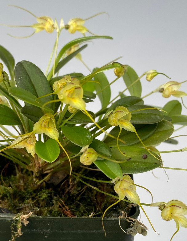 The albino flower variety of a miniature species native to Costa Rica, Panama, Colombia, Ecuador and Peru. This is one of the easiest growing miniature Masdevallia around, putting out multiple growths per year. Grows well in shady, cool to intermediate conditions. Likes higher humidity, and can also grow on a slab if you have 75%+ humidity levels and water frequently. Very fun species! We are currently offering divisions from our mother plant, potted in New Zealand sphagnum moss in 2" pots represented in the last photo.