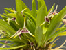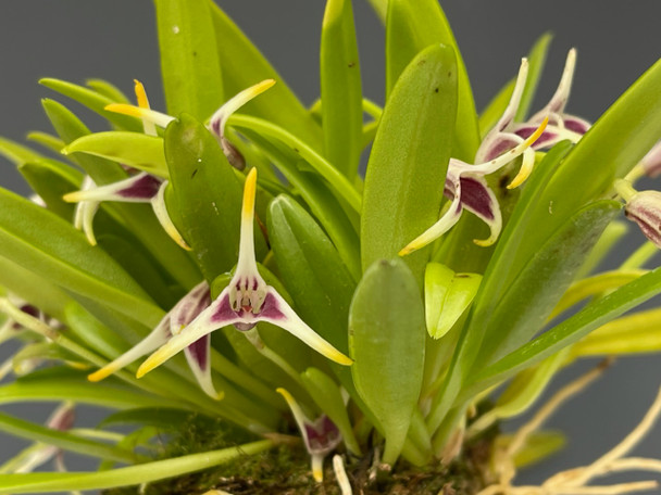 Native to Venezuela and Columbia, this Intermediate to warm growing miniature Masdevallia has stiffer, narrow 2-2.5" leaves that clump tightly together at the base. The one inch flowers are triangular with the tips of the flowers being yellow and an interior of white and burgundy. These have a very slight fragrance and are long lasting. This plant can flower twice per year usually in spring and fall. Grow in low to medium light and in intermediate to warm temperatures. Water as the media becomes slightly damp to the touch.