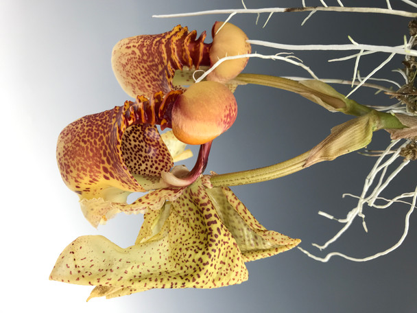 A totally wild-looking bucket-shaped super-fragrant-flowered orchid from South America. Native to Trinidad, French Guiana, Surinam, Guyana, Venezuela, Colombia, Peru and Brazil. They grow in lowland wet forests and do best grown warm and wet. They love fertilizer as well. The flowers are showy and short lived, about 3 days to be exact. The process of watching them open is fun as they have very alien-like flower buds. Larger plants can flower more than once per season (spring-summer), giving you a bit more than 3 days of flowers out of the year!