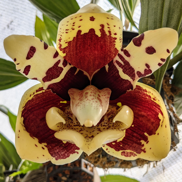 This spring of 2022, we are offering potted, rooted back-bulb Stanhopea species that were divided from our collection plants during the summer of 2021. These divisions are established but have older leafless bulbs which function to fuel the emergence of new growths and flower spikes. These orchids are potted in coconut husk chunks in plastic azalea pots. The flower stems can grow over the rim or through a drain hole. However, they will flower the easiest in a basket packed with sphagnum moss. Both coco husk and sphagnum moss, along with the orchid baskets are available on our website. Water and fertilize heavy in the summer for maximum results!
