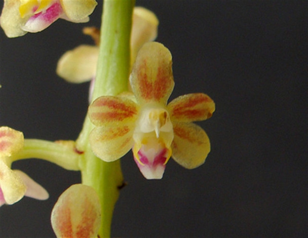 A medium sized terete-leafed epiphyte from Assam India, Bangladesh, eastern Himalayas, Bhutan, Sikkim, Myanamar, Thailand, Cambodia, Vietnam, Malaysian peninsula, Sumatra, Java, Lesser Sunda Islands, Borneo, the Moluccas, Sulawesi, and the Philippines. A vanda relative, the flowers are not very large, but look really cool and large plants can produce multiple branching spikes.