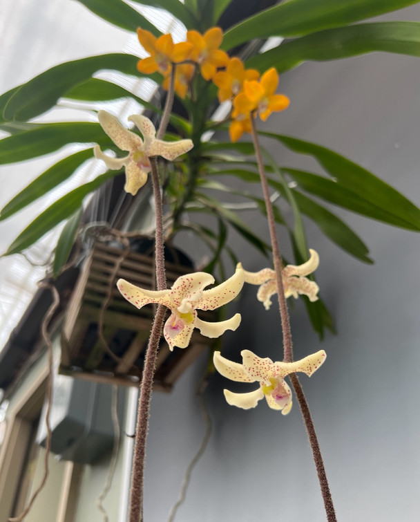 A species found in Sabah in riverine and lower montane forests on the eastern slopes of Mt Kinabalu. It prefers warm temperatues and bright light. The unique part of this species is that the basal flowers (flowers near the plant) are a different color, and fragrant, compared to the distal flowers afterwards. The basal flowers can vary from yellow to orange.