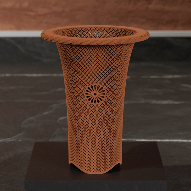 From our in-house line of speciality orchid pots, this is the Royal Kiku design presented on an extended trumpet pot, most often used for Cymbidiums.