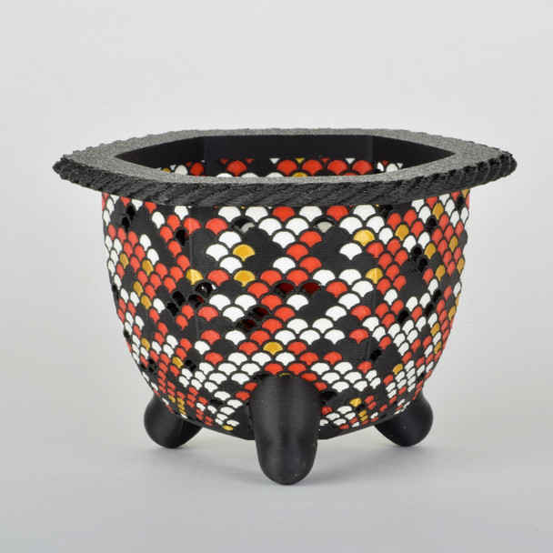 The Koirin design wraps your orchid in a scale-like lattice of white, red, black, and gold. This design has a more closed design and will have slightly longer dry-out times.