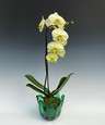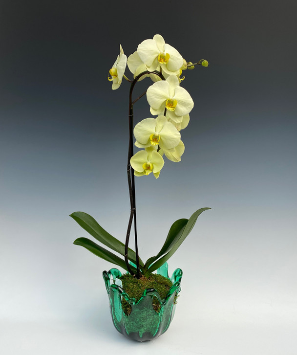 Have the Phalaenopsis you are ordering made into an arrangement! We take the Phal. of your choice and pot it up into an elegant glass planter, add decorative moss, and tie the flower spikes using decorative wire. The photo provides an example of what you will receive, with flower color based on the orchid you are purchasing.