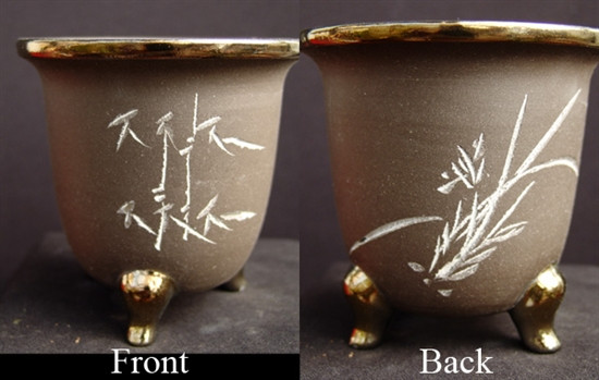 This is a Chinese purple clay pot, using a style often associated with East Asian orchids such as Neofinetia falcata or Dendrobium moniliforme. It is unglazed purple clay with etched patterns with gold plated feet and rim.
