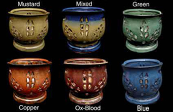 These pots have attached saucers and are made to fit a 5" to 5.5" plastic pot. These pots are made so it is almost impossible for the orchid to stand in water. The attached saucer also has side drainage. The perforation designs provide excellent air flow. These pots come in six different colors with a glossy finish. Color shades vary slightly from pot to pot. They are perfect for Phalaenopsis!