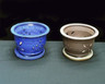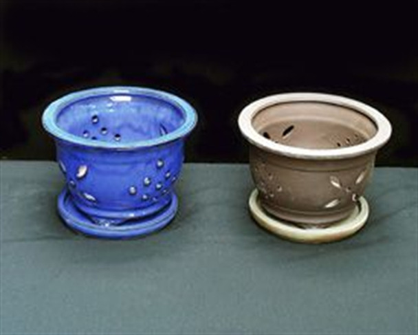 These Chinese orchid pots come glazed (blue) or unglazed (brown). In the photo above, the unglazed pot is on the right. The color is a grayish brown. Shades vary from pot to pot. The 7" size will hold a 6.5" plastic pot; the 5" size will hold a 4" plastic pot. Each pot comes with a saucer.