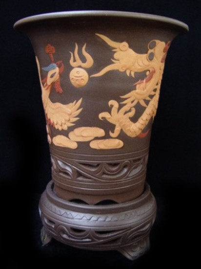 Chinese Pot: Phoenix & dragon relief vase with stand
