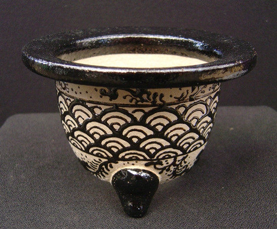 This is a Nishiki Bachi (also referred to as Raku Hachi) from the Aichi prefecture in Japan. Aichi produces the most Neofinetia pots in Japan, and offers the most variety of artwork. These pots are made out of very porous clay and breath well with a large drain hole opening on the bottom of the pot.