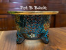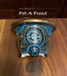 Pot A - Has a 3 1/8 inch inside diameter. Has an arabesque floral pattern, heavily spotted with gold accents above each leg.