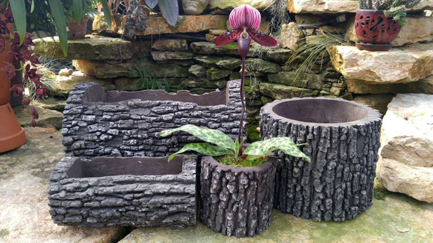 A fantastic new way to display your orchids in a 'natural' setting! These planters are made of heavy duty polystyrene foam, grooved and spray-painted to appear like natural oak logs.