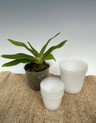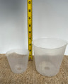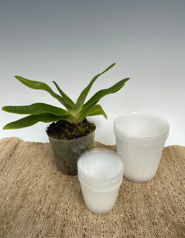 This is the most inexpensive clear container on the market. It is mostly used in Taiwan for mass production Phalaeonpsis. They are very thin walled, but are great for those who have lots of repotting to be done and are on a budget. They only come in two sizes, 3" and 4". See photos with ruler for reference. They have a single drain hole on the bottom, so they hold moisture well. We have had very good luck with Paphiopedilum, Phragmipedium and Phalaenopsis. There's no reason you can't use these on any orchids. You simply adjust the potting media based on how quickly you want them to dry out (example, medium or coarse bark).