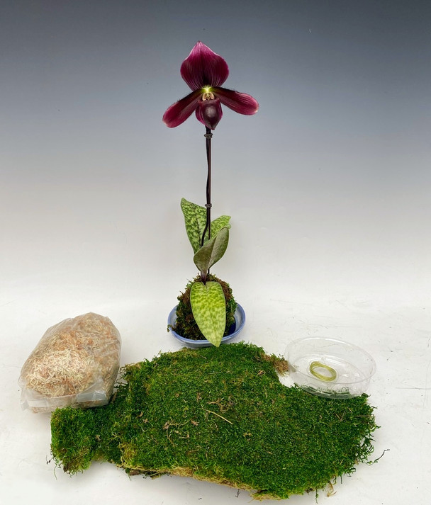 This kit includes enough sphagnum moss, sheet moss & fishing line (about 20 ft) and 6" plastic saucer to create a Kokedama for up to an 6" round moss ball. *Photo of Paph in Kokedama is an example and is not included.